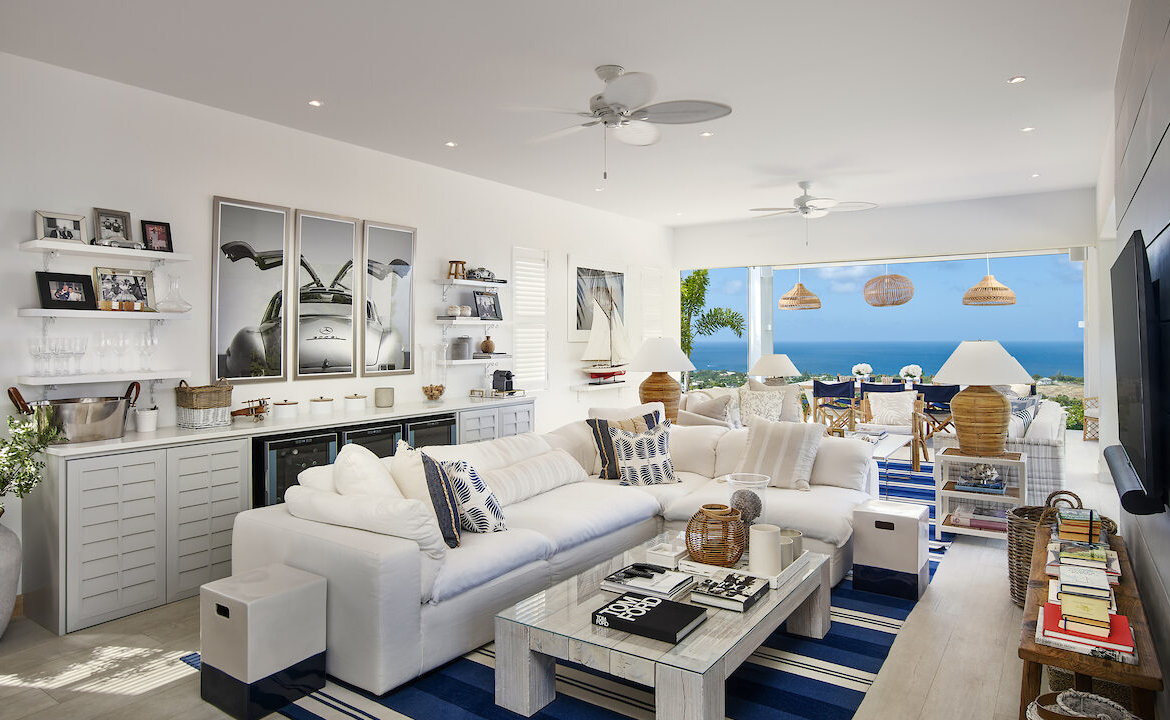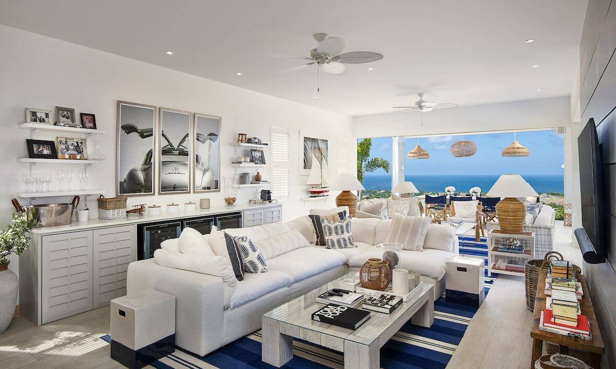 The upper level features four bedrooms, a large pool deck, a kitchen, and living and dining areas. The views from the pool deck are transcendent, making it the perfect spot for dining and entertainment. The living areas showcase an open-plan design, decorated with white tones, nautical blues, and contemporary black-and-white photography.